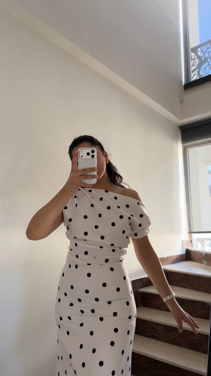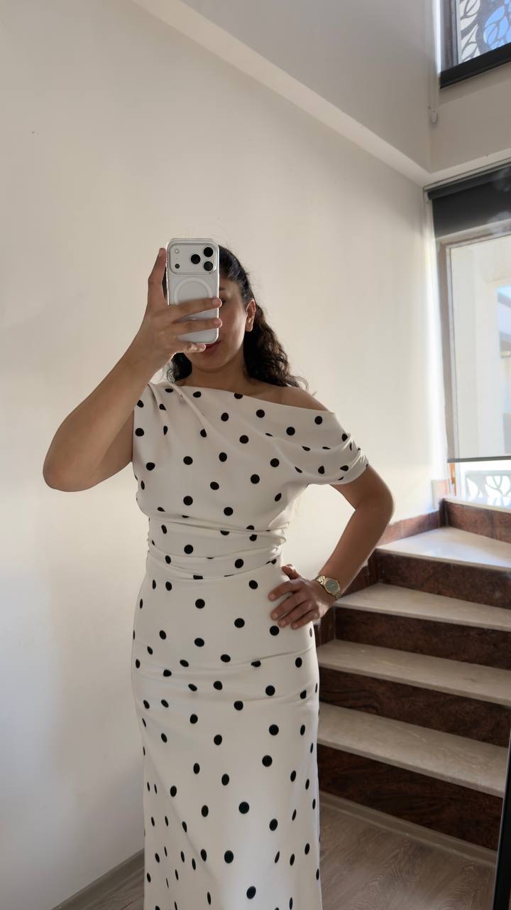 Klasik puantiye desenini modern bir kesimle buluşturan bu elbise, şık ve zarif görünümüyle gardırobunuzun favori parçalarından biri olmaya aday. Omuzları açıkta bırakan Madonna yaka tasarımı feminen bir duruş kazandırırken, bel bölgesini toparlayan formu vücut hatlarını zarifçe ortaya çıkarır.