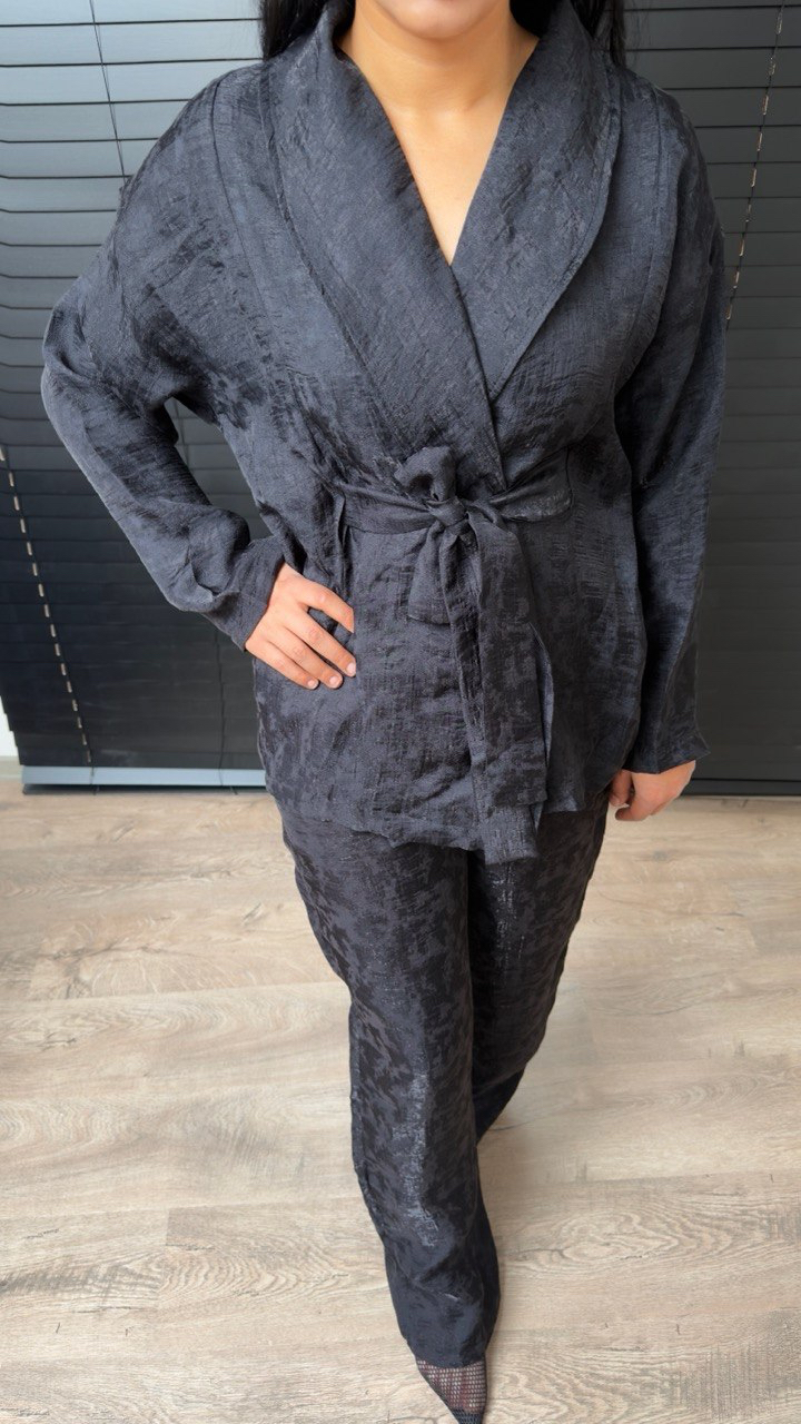 Şıklığı ve konforu bir arada sunan saten ikili takım, modern duruşu ve zarif dokusuyla dikkat çekiyor. Kuşak detaylı, kruvaze yaka üst tasarımı bedene hoş bir form kazandırırken; rahat kesim pantolonu gün boyu konfor sağlıyor. Işıltılı ve akışkan saten kumaşı sayesinde hem özel davetlerde hem de şık günlük kombinlerde rahatlıkla tercih edebilirsiniz. Feminen ve güçlü bir görünüm sunan bu takım, topuklu ayakkabı ve minimal aksesuarlarla kusursuz bir stil oluşturur.