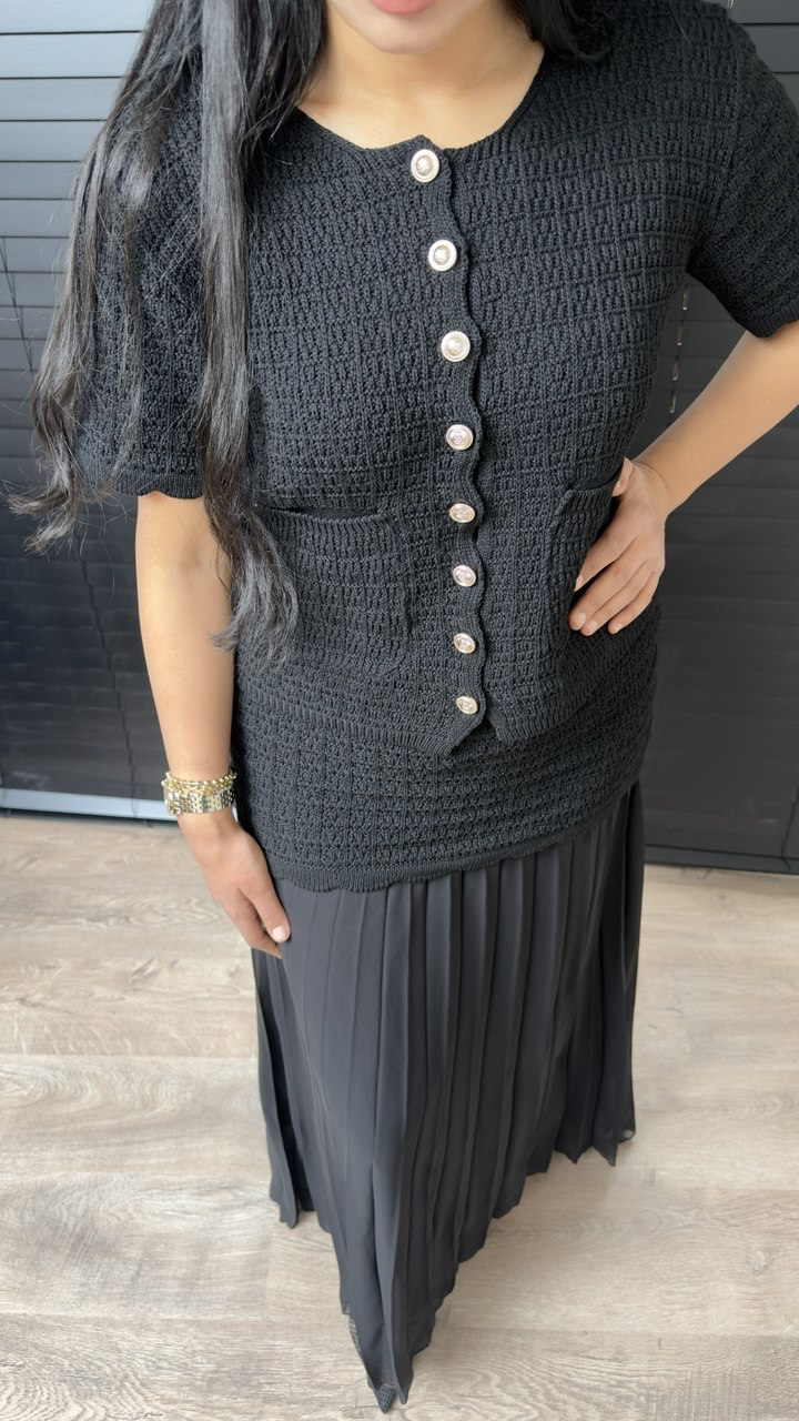 Zarif ve asil duruşuyla öne çıkan siyah şifon etekli elbise, klasik şıklığı modern detaylarla buluşturuyor. Üst kısmındaki dokulu kumaş yapısı ve dikkat çekici düğme detayları elbiseye sofistike bir hava katarken, hafif pliseli şifon eteği akıcı ve feminen bir görünüm sunar.