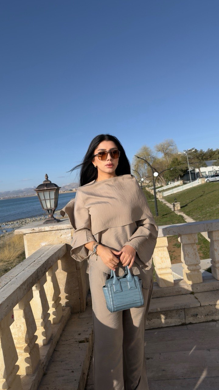 Zarif ve modern çizgileri bir araya getiren vizon takım, sade şıklığı güçlü bir duruşla tamamlıyor. Katmanlı üst detayı ve volanlı kol tasarımı modele hareket katarken, rahat kesimli pantolonu gün boyu konforlu kullanım sunar. Akışkan kumaşı ve soft tonu sayesinde hem günlük şıklıkta hem de özel davetlerde kolayca tercih edilebilecek zamansız bir parçadır.